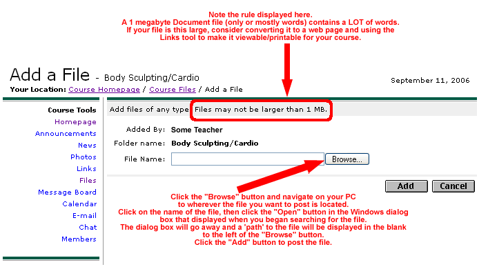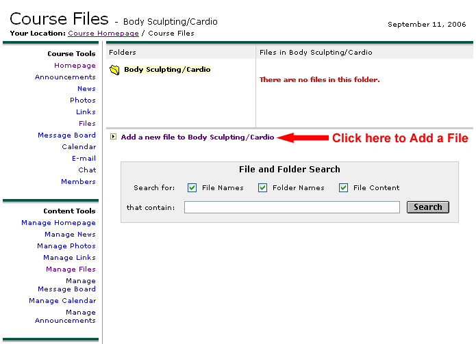 The next screen will display any files already posted or, as in the picture below where none have been posted, the clever notice in red that says "There are no files in this folder." Note the folder icon with the name that matches your Course Name. Click on the blue link in the section beneath the Folder icon that says "Add a new file to YOUR COURSE NAME ." In other words, the last part of the link contains the Course Name. (See the picture below)
