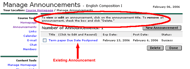 To Edit/Correct/Delete an Shared File - Use the "Manage Shared Files" link under the bold heading "Content Tools" to change an existing Shared File: Click on the name of the announcement to open the Compose screen where you can make changes (see picture below).