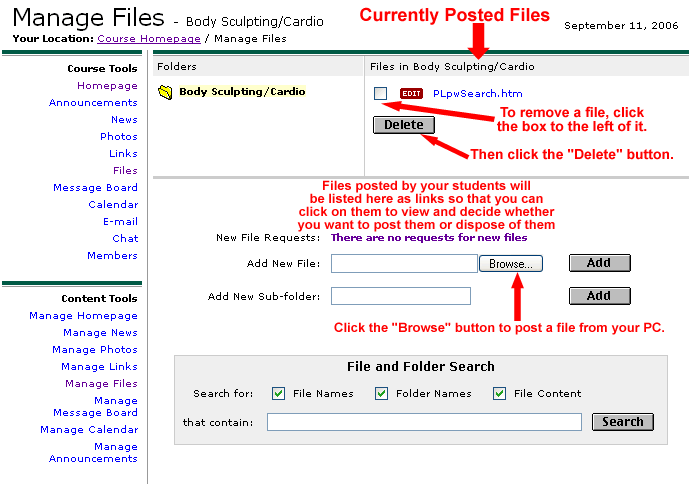 First, the right hand section lists the files that are currently posted for your course. If you wish, you can click on the file name (which is a link) to look at a file in case you don't remember exactly what it is. You can also click the box next to it, then click the "Delete" button to remove the file from the Files List.