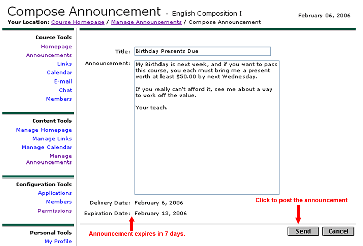 Note the instructions on the "Compose" screen as pictured below. Essentially, what they are saying is that when you finish editing this announcement, it will be sent as a NEW announcement, and the one you have already posted will still be there. In that case, you would have to click on "Manage Shared Files," then click the box to the left of the old announcement, then click the "Delete" button. A dialog box will ask you to confirm the deletion. Click "OK." Below is the Compose Screen where you can make changes. Note that the announcement will expire from the date you make any changes on this screen.