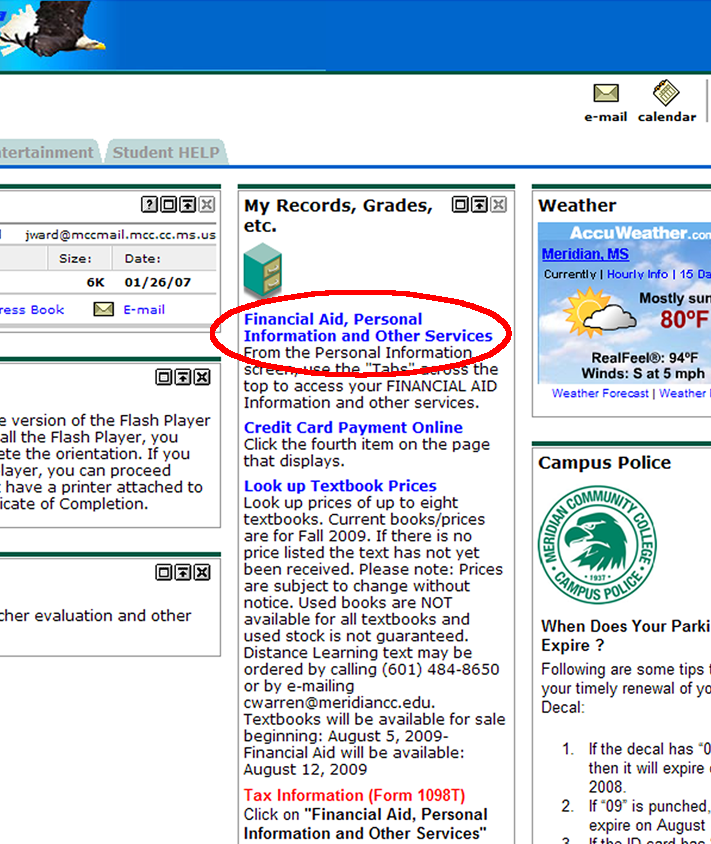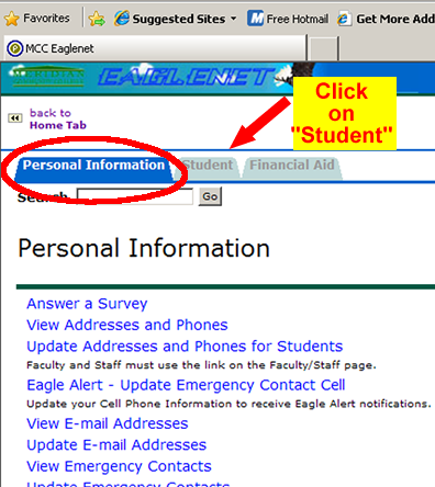 Click the link at the top of the third column on the page that displays when you log in to the Eaglenet. The link is just below a drawing of a File cabinet and says “Financial Aid, Personal Information and Other Services” as pictured here: