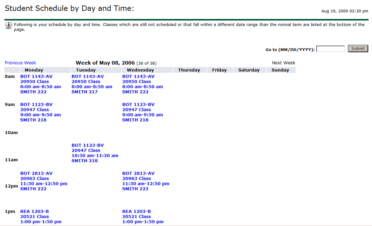Inputting a date in the format shown above and clicking the Submit button changes the display so that ALL days are visible. Note that Friday in the schedule below now displays classes thanks to the date change.