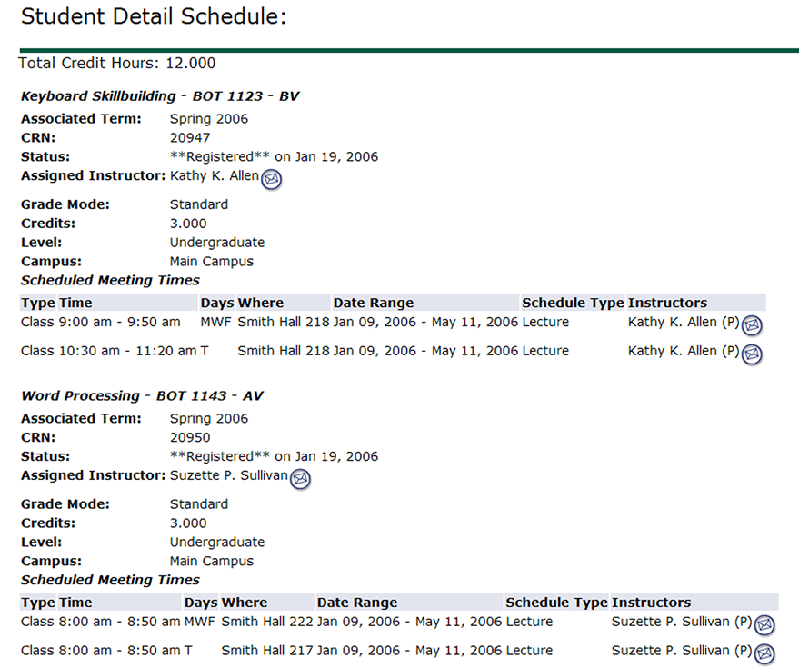 The Student detail Schedule simply lists each course and some information about it, such as the Day & Time, Instructor name, etc.