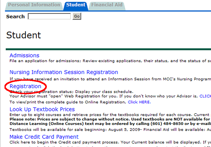 On the Student Tab, look for the item “Registration” and click on it.
